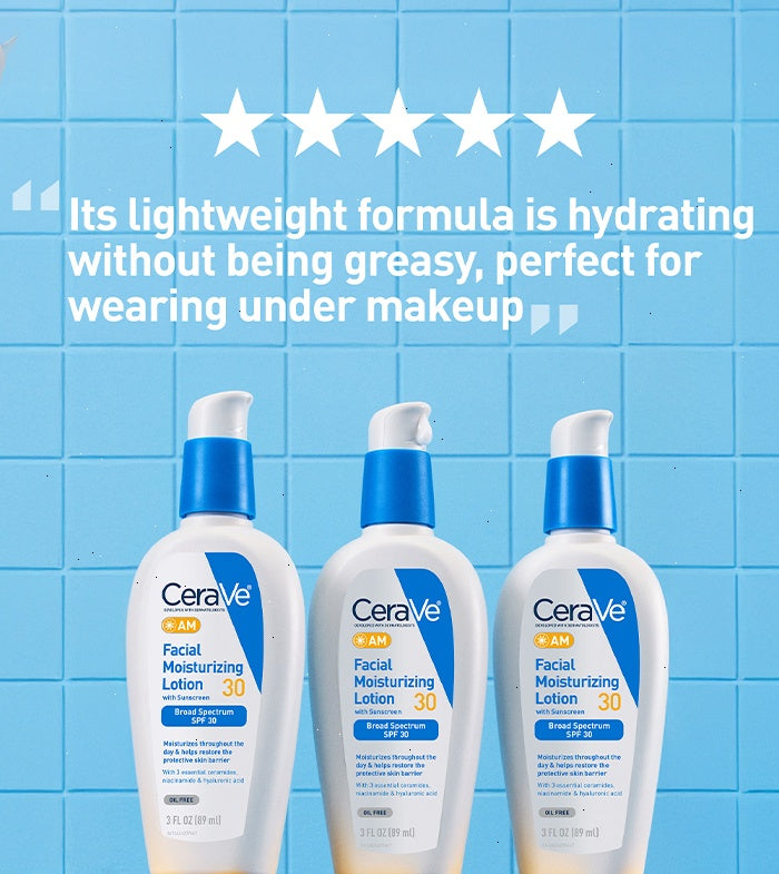 CeraVe AM Facial Moisturizer with broad spectrum SPF 30 sunscreen is a morning skincare multitasker that provides continuous hydration throughout the day while helping to absorb and reflect the sun’s damaging UVA and UVB rays and restore the skin's protective barrier.